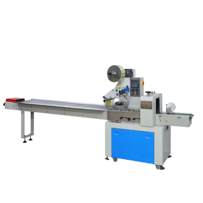 The machine produces pillow bags for packaging.