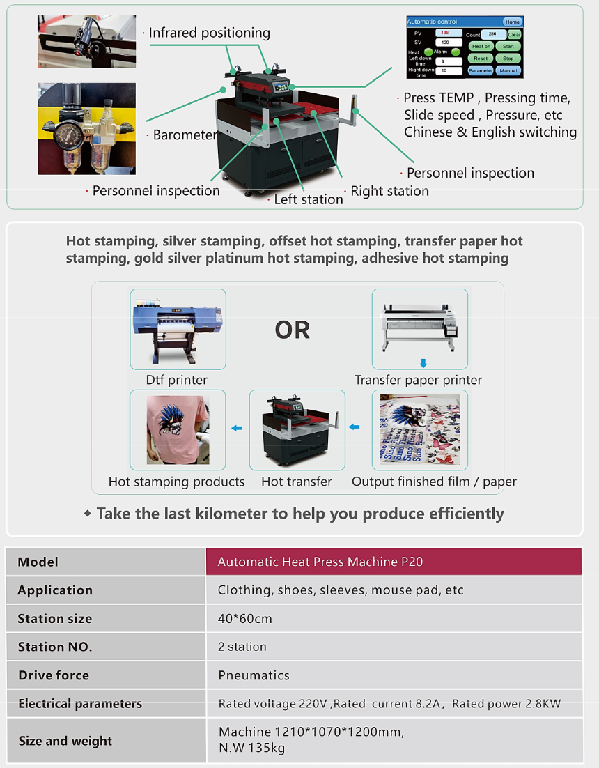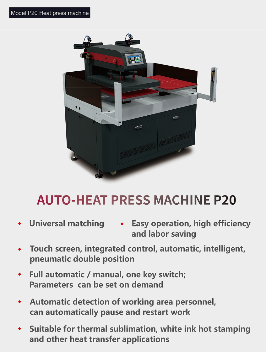 The Automatic Heat Press Machine P20 is designed for transferring designs onto various materials such as t-shirts, bags, and other fabric items using heat and pressure.