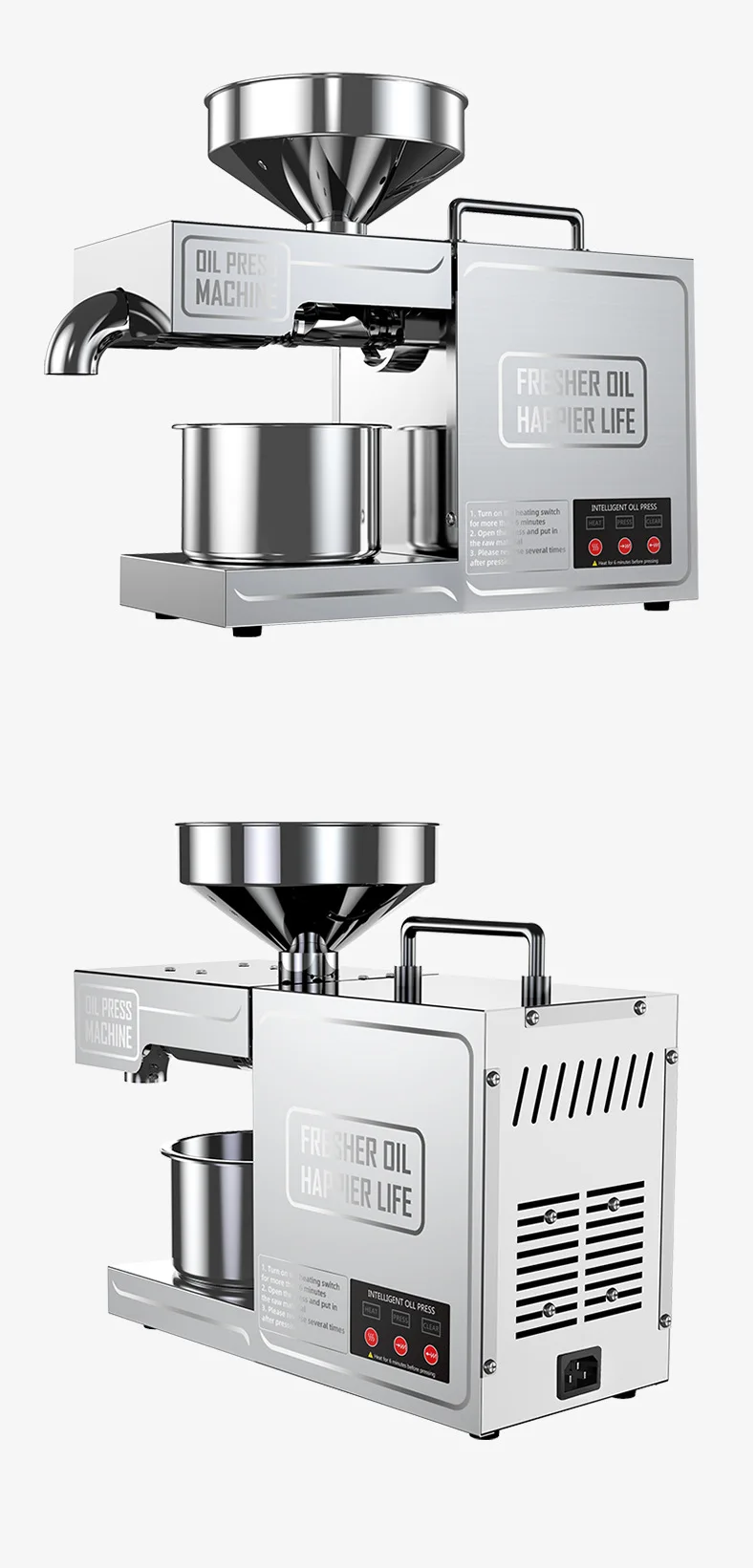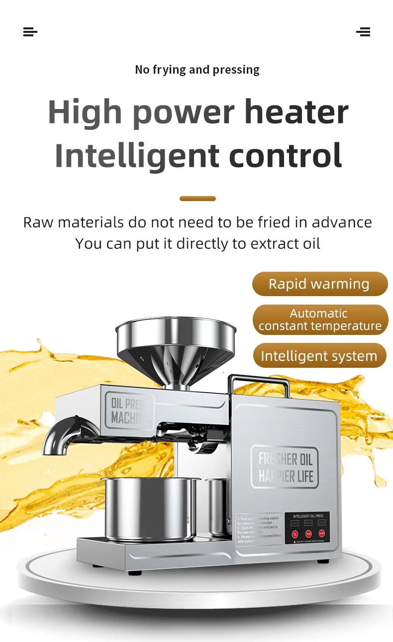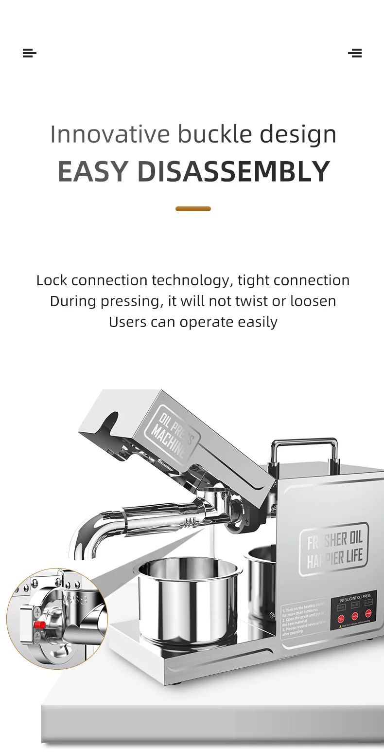 The machine's 820W rated power and 200W motor work together to provide high-efficiency oil extraction with minimal effort.