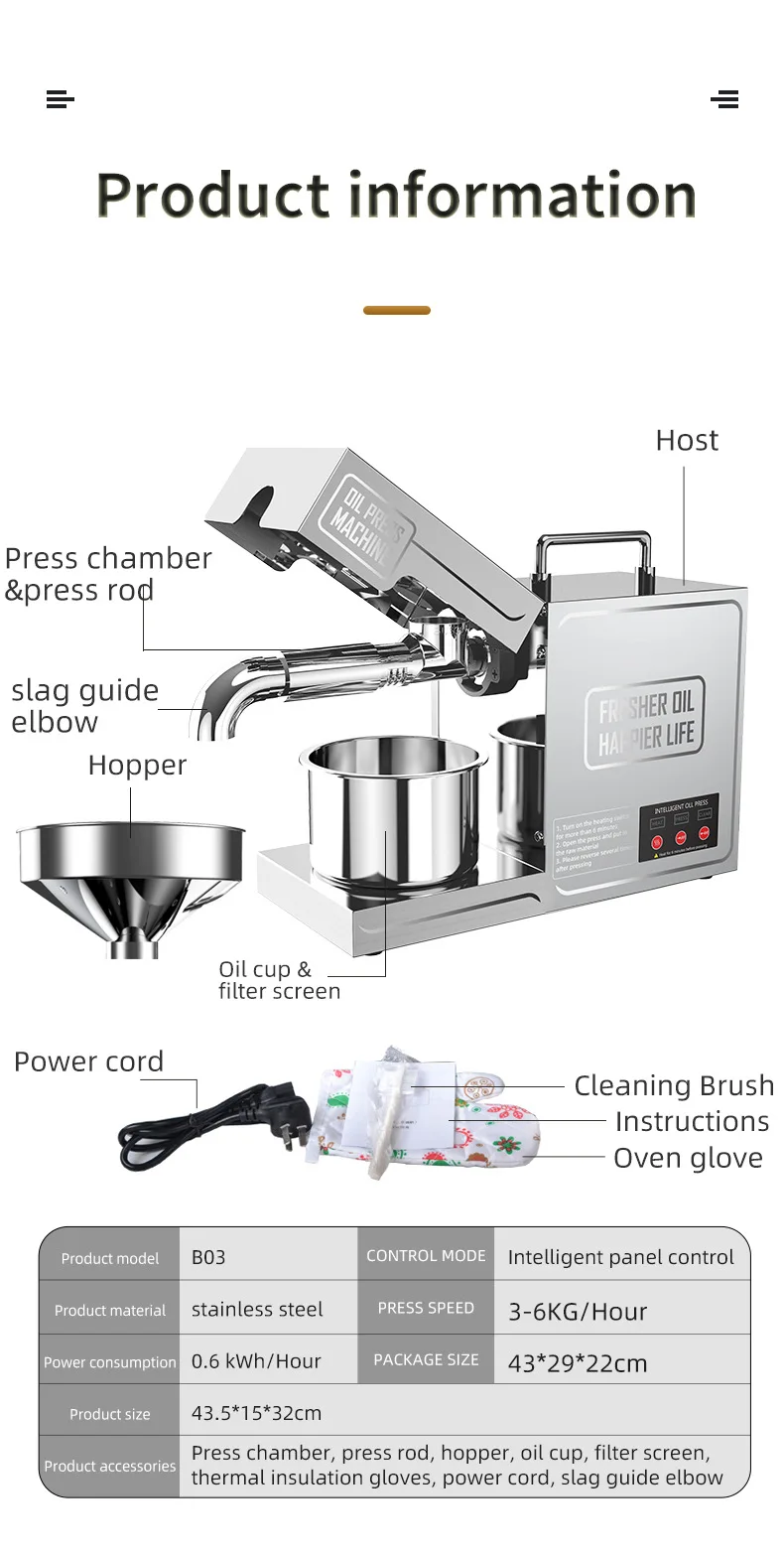 The B03 Oil Press Machine has a rated power of 820W and operates with a 200W motor for efficient oil extraction.