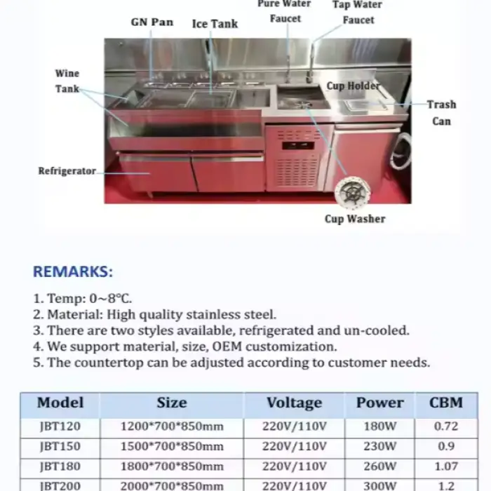 The Bartender Table is available in several voltage options: 220-240V, 380V, and 110V.
