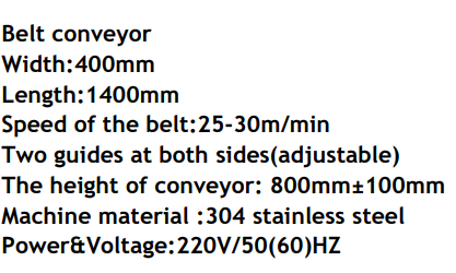 The conveyor has an adjustable width of 400mm and a standard length of 1400mm, allowing it to fit different operational needs.
