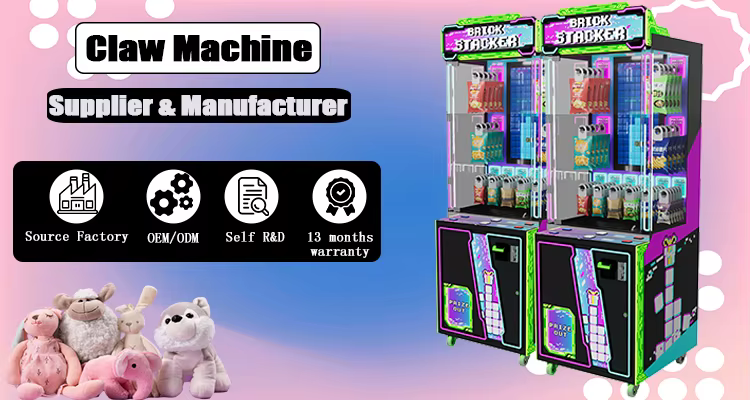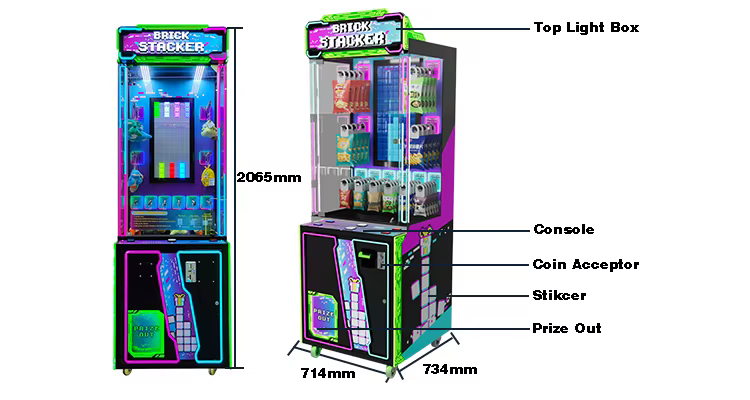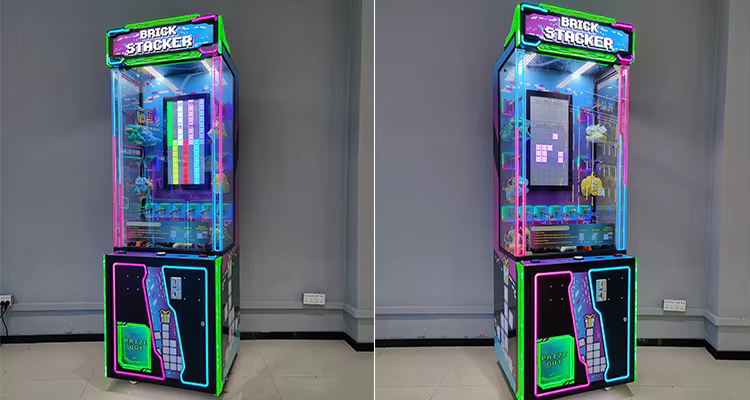 The Brick Stacker is a skill-based arcade game where players stack bricks to win prizes. It features a robust design and is suitable for players of all ages.