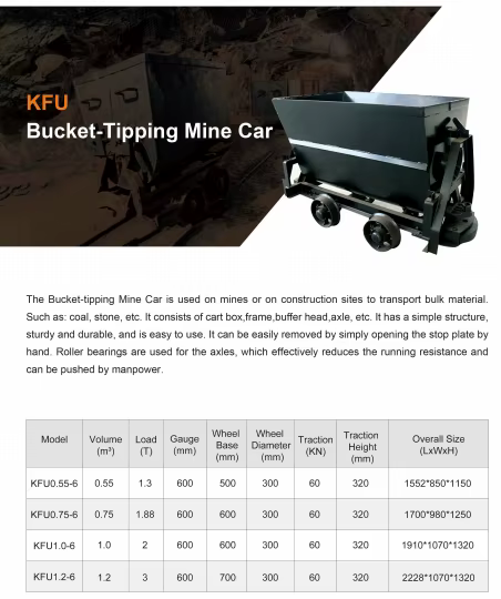 Key features include a bucket-tipping design for easy unloading, high payload capacity, robust construction, an efficient rail system for smooth transport, and compact dimensions for versatile use.