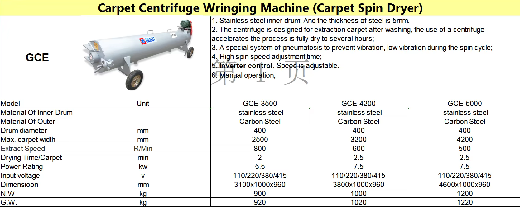 Carpet Centrifuge Wringing Machine (Carpet Spin Dryer) - Model GCE-4200