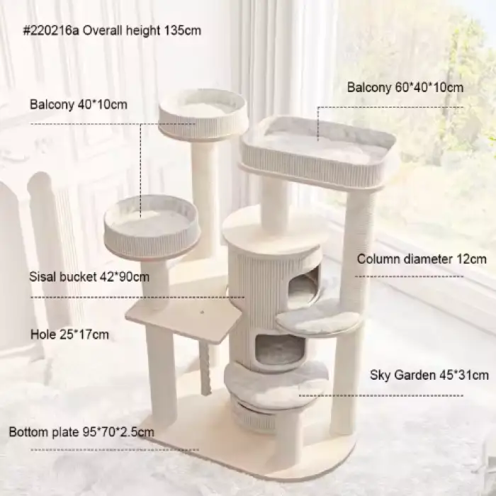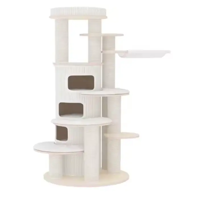 Key features include a multi-level design for climbing, durable scratching posts made from natural sisal, and soft cotton velvet for resting.