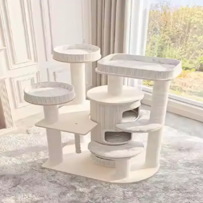 The Honeypot Cat Tree is made from high-quality wooden materials, natural sisal rope for scratching posts, and thickened cotton velvet for cozy resting spots.