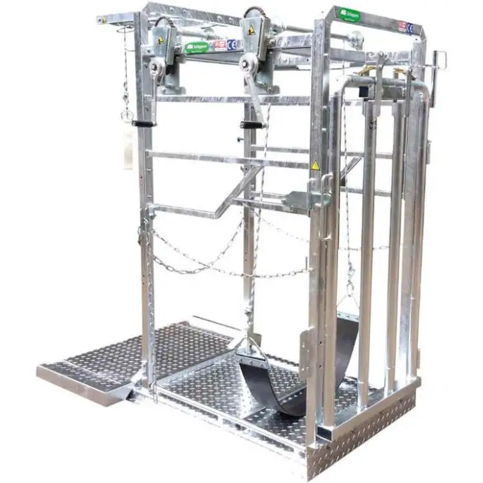 It can be used for hoof trimming, veterinary examinations, weight measurement, and general livestock handling.
