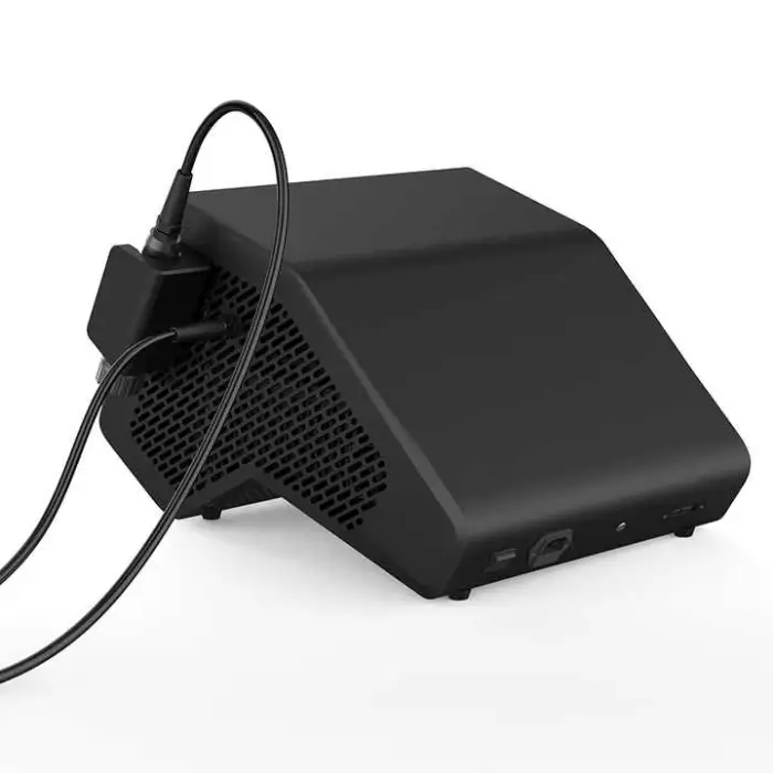 The device is packaged in a black plastic box.