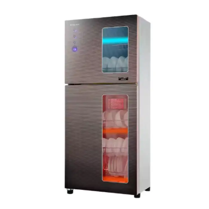 The cabinet is made from high-quality stainless steel, tempered glass, and aluminum alloy, ensuring durability and a modern design.