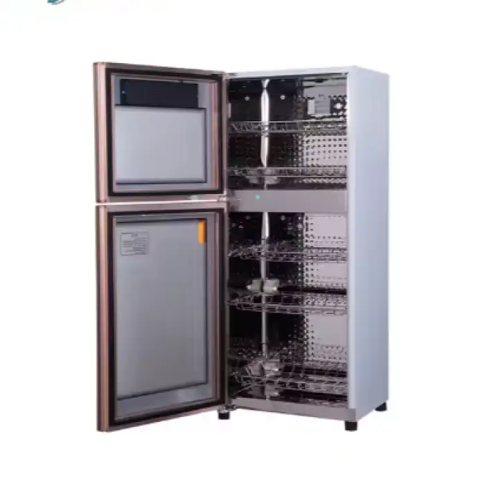 The cabinet has a large capacity of 100 liters, making it suitable for storing and disinfecting a significant amount of items.