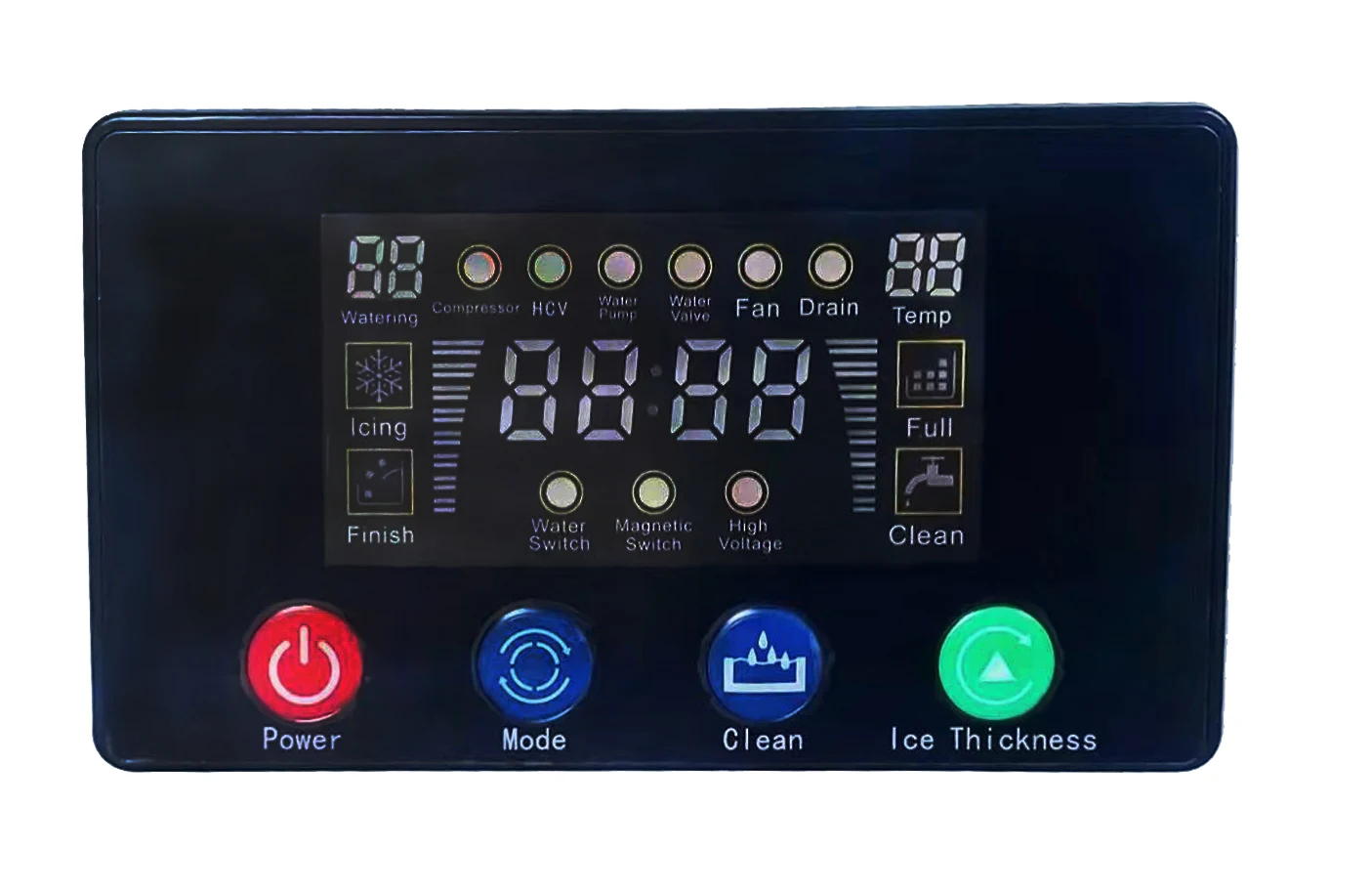 The control panel features one-click ice making, a one-button cleaning function, and an easy-to-read English display.