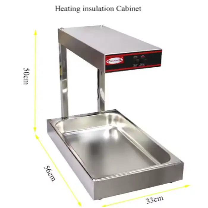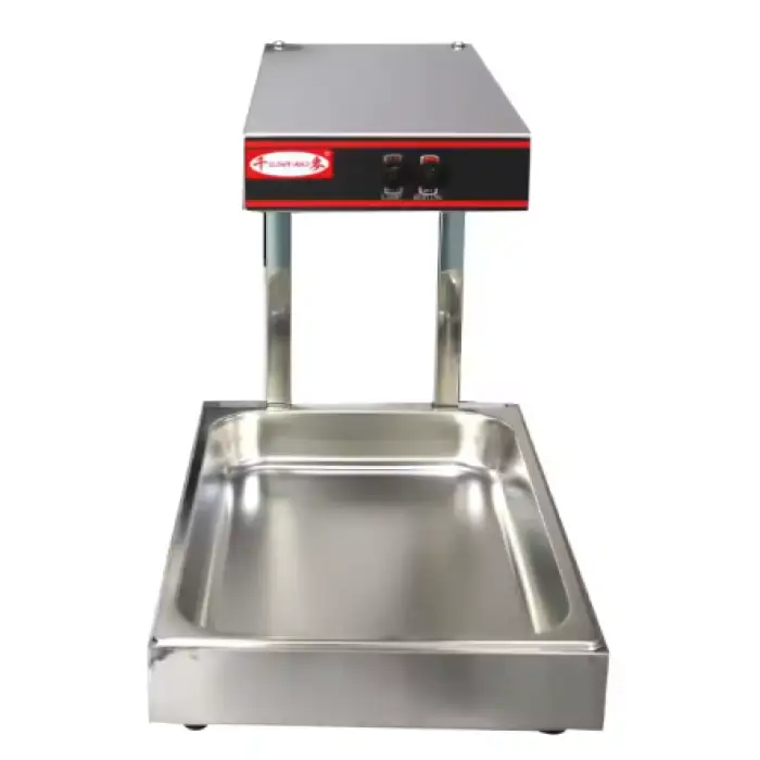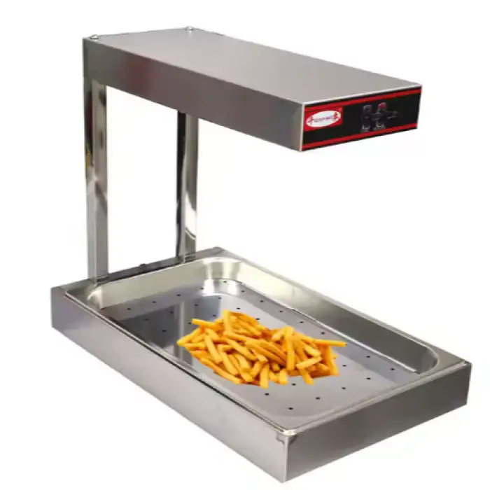 The warmer is ideal for displaying fries, potato chips, chicken, and other snacks.