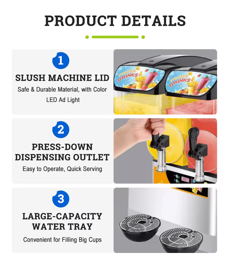 This slushie machine is perfect for cafes, bubble tea shops, restaurants, diners, events, parties, and convenience stores.