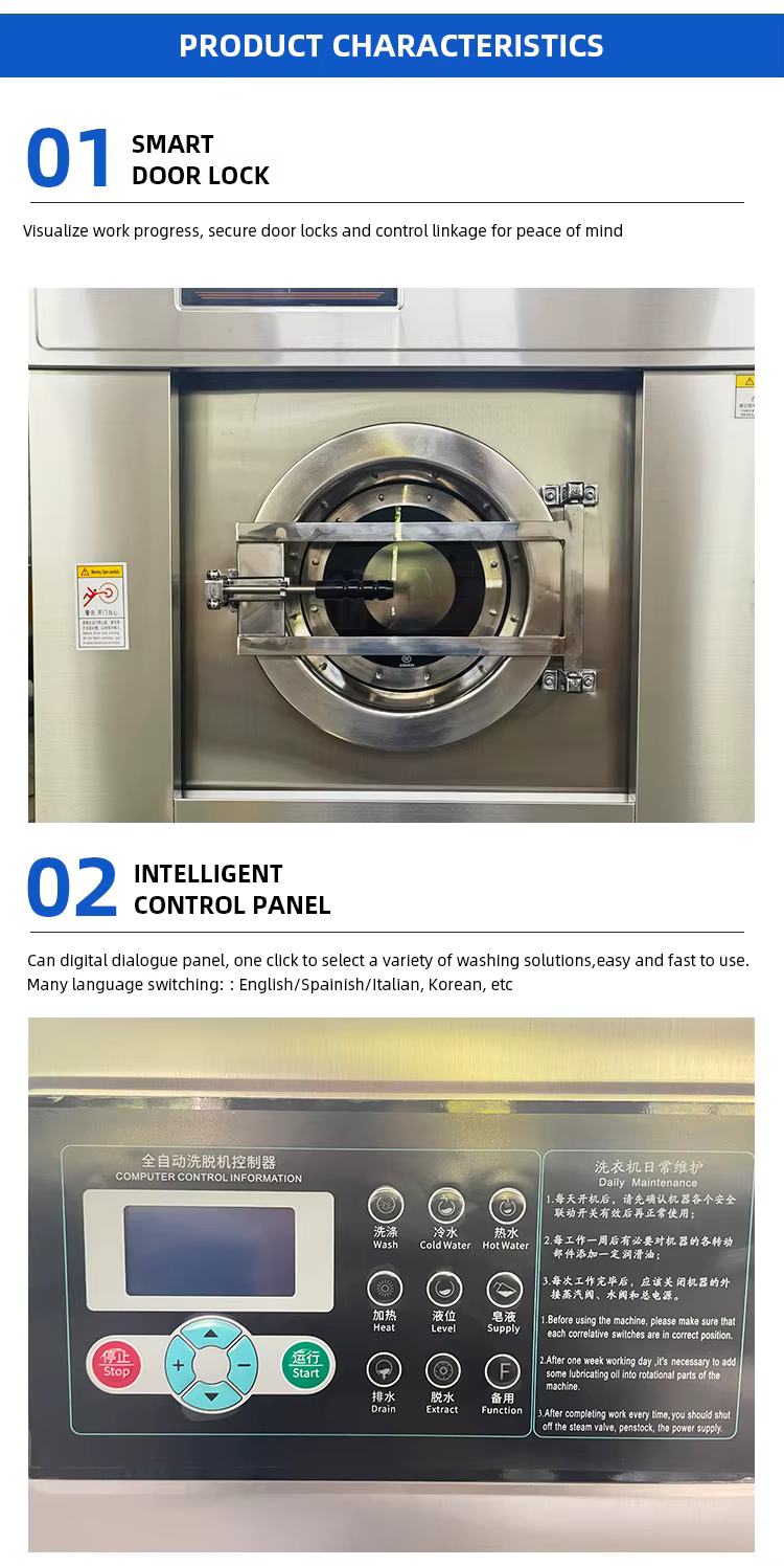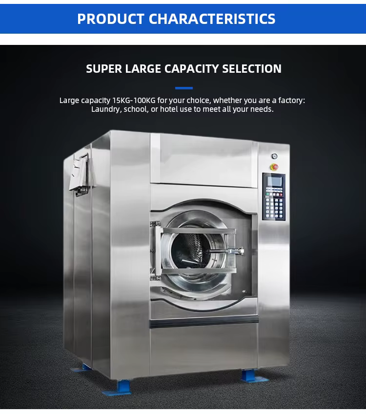 The machine has a capacity range of 15kg to 100kg, making it suitable for various laundry loads.