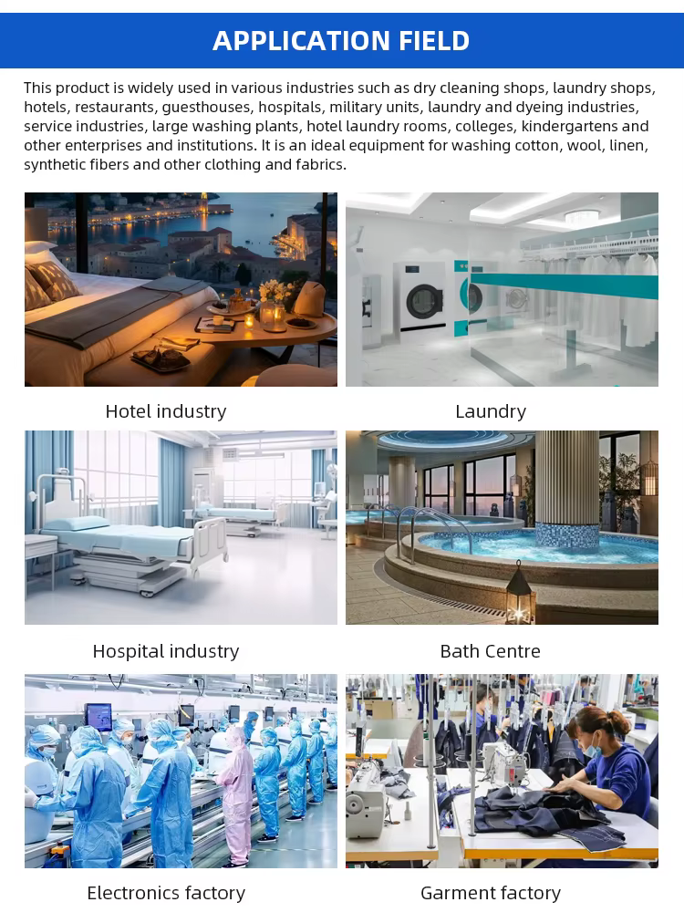 The machine is designed for use in hotels, factories, laundries, and hospitals.