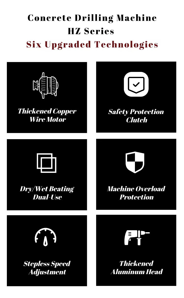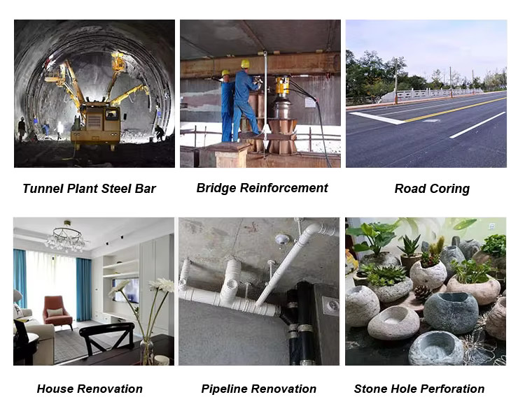 It is suitable for core drilling in concrete structures, renovation projects, building foundations and walls, and installation of plumbing and electrical systems.