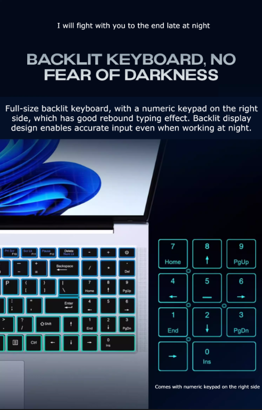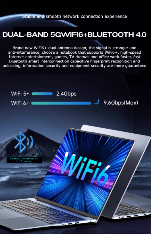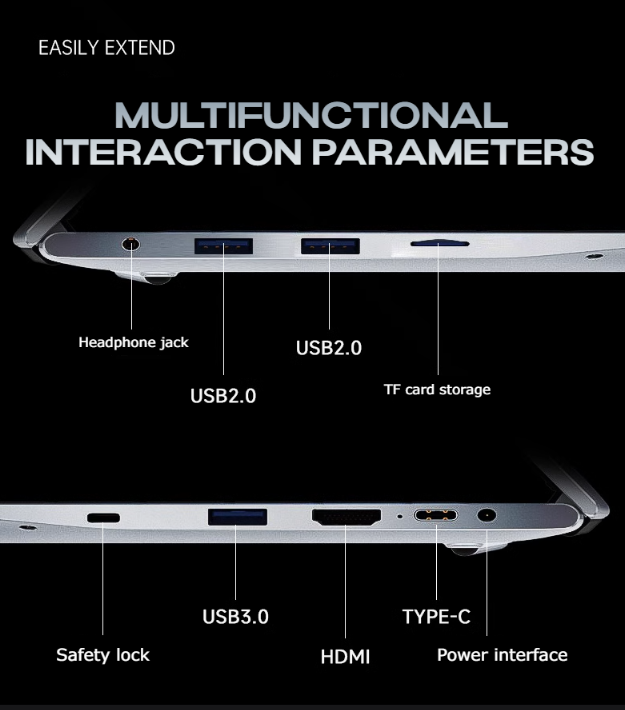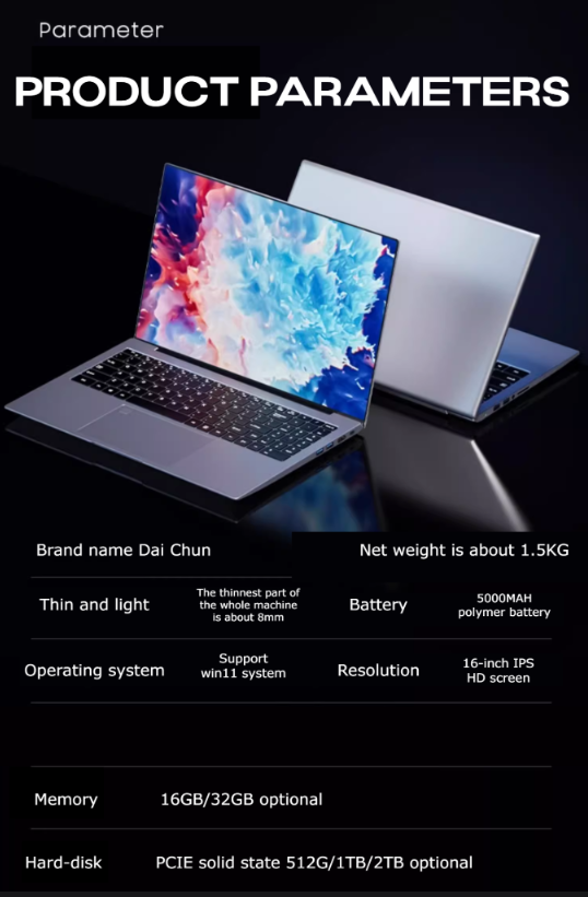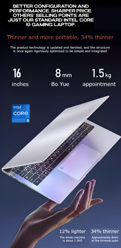 The laptop has an ultra-thin profile with a thickness of 10mm to 15mm, making it lightweight and easy to carry.