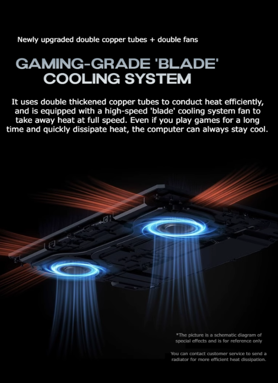 It includes dual fans and dual heat pipes designed for efficient cooling, particularly during extended use.