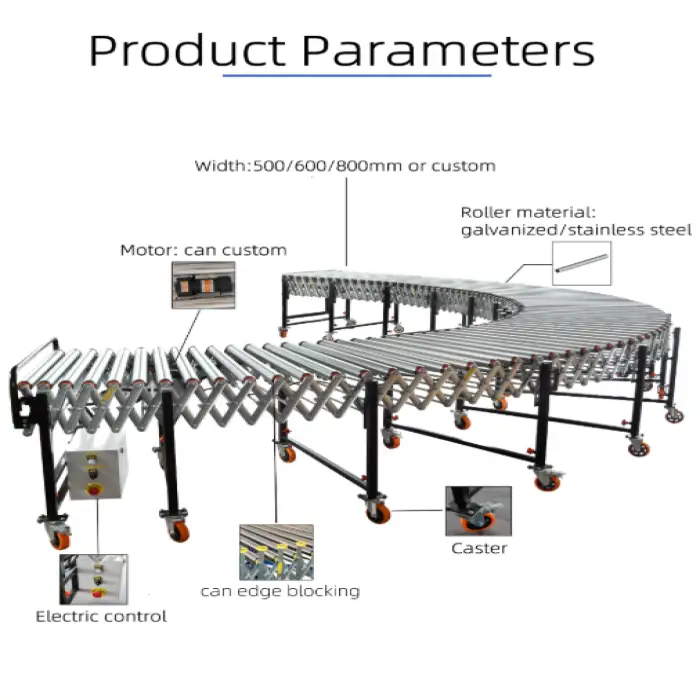 The conveyor line is available in width options of 500mm, 600mm, 800mm, 1000mm, and 1200mm.
