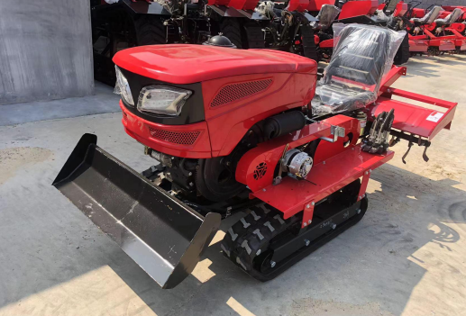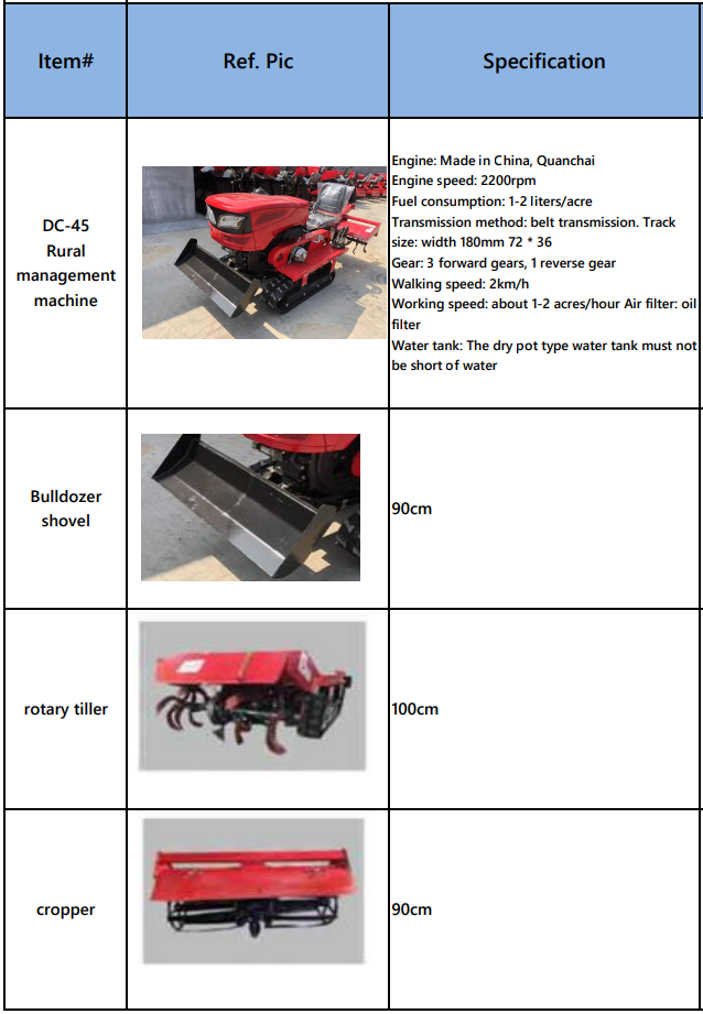 The DC-45 features a Bulldozer shovel, Rotary Tiller, Cropper, Backfilling Machine, and Ditching Machine, making it a versatile all-in-one solution for rural management.