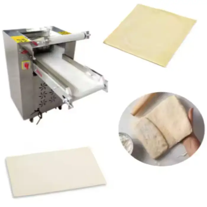 Key features include automatic kneading, high efficiency, stainless steel construction, and adjustable dough roll width.