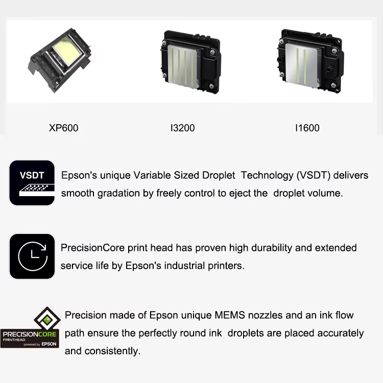 The machine uses double Epson print heads, specifically XP600, I1600, and I3200.