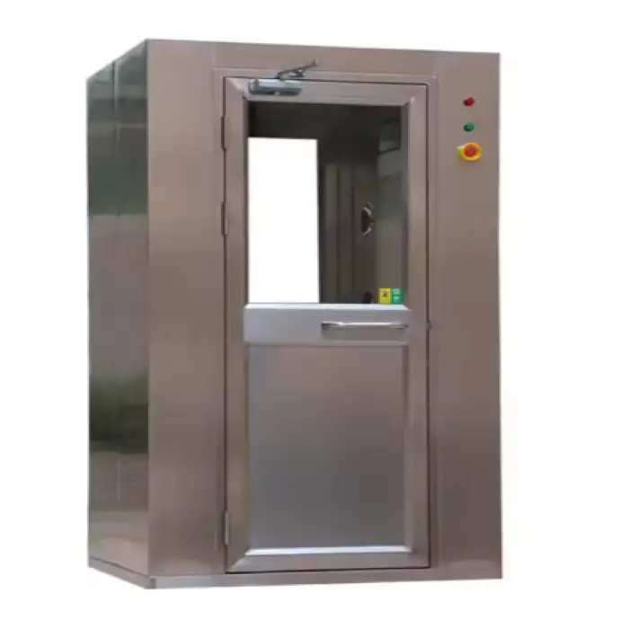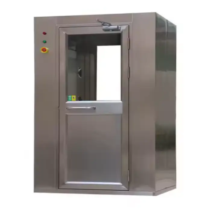 The air shower is suitable for various industries, including laboratories, pharmaceutical manufacturing, electronics production, biotechnology research, and food processing.