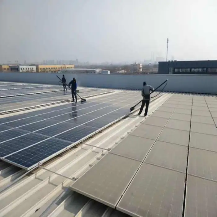 The cleaner operates using solar power, featuring a motorized design that integrates a water feeder to effectively remove dirt and grime from solar panels.