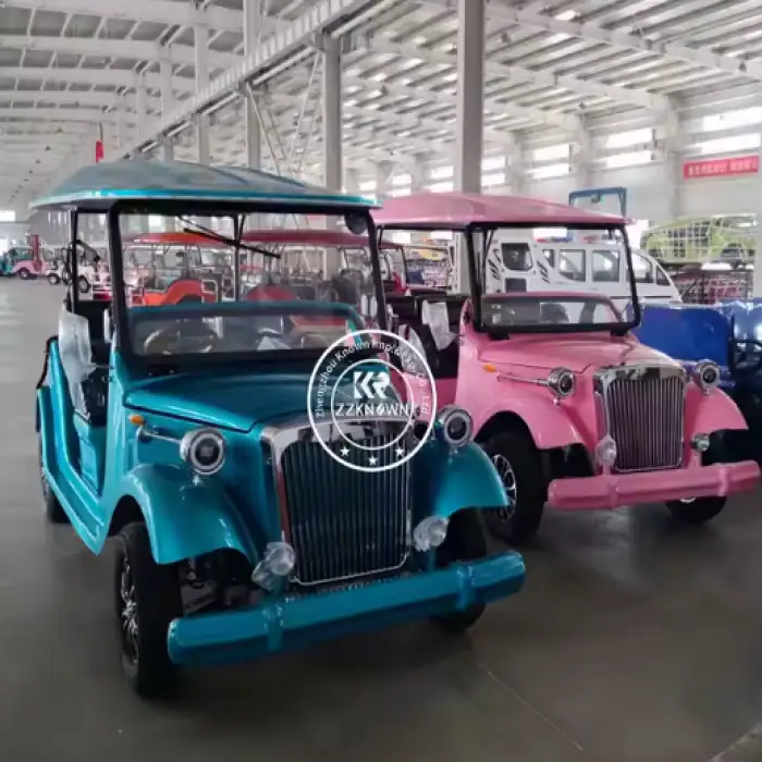 The electric golf cart is powered by a high-capacity rechargeable battery that provides efficient performance and long-lasting usage.