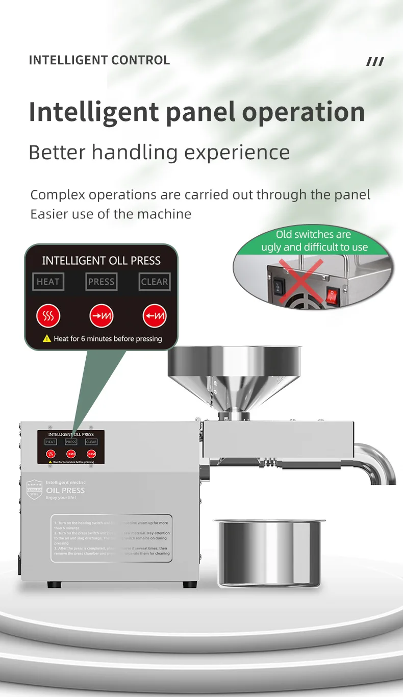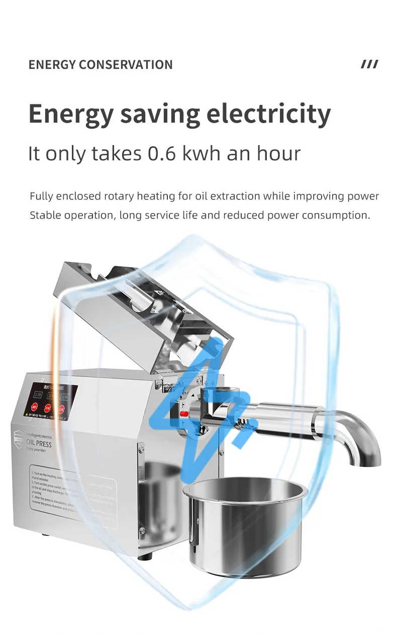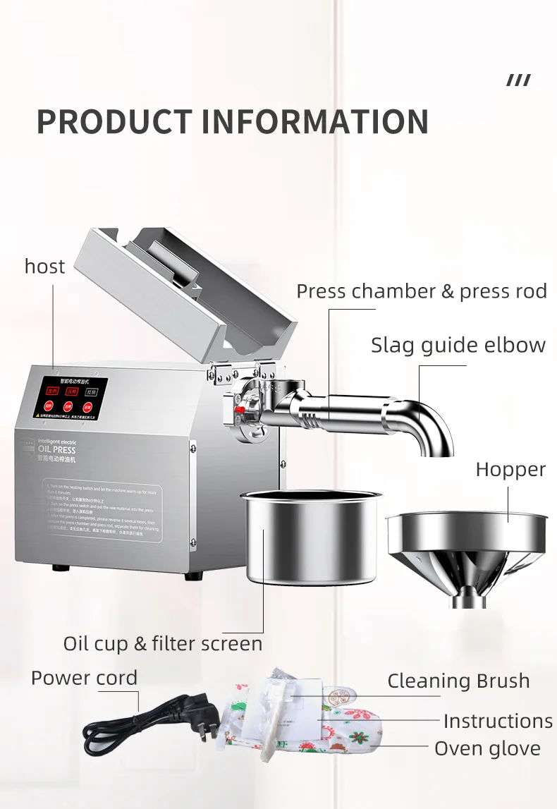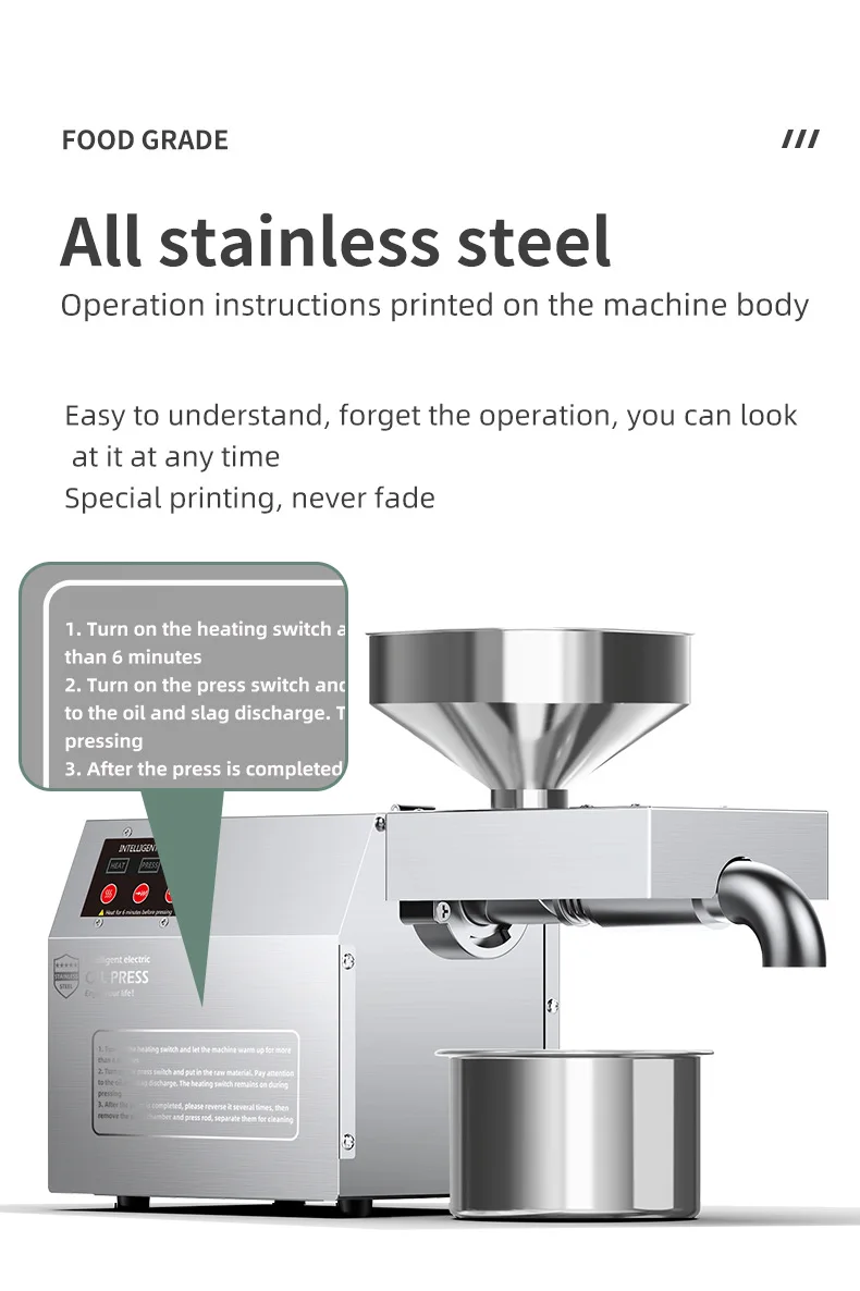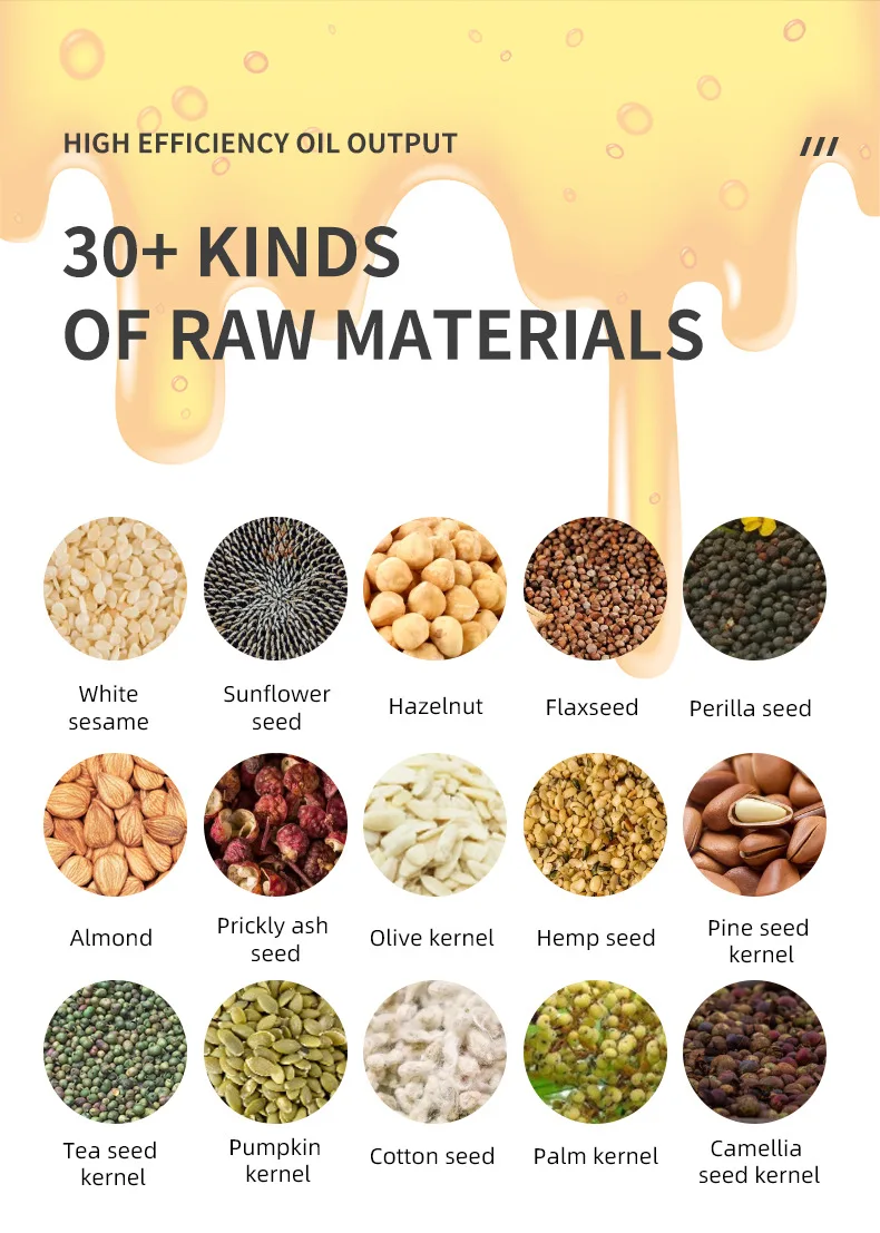 The Electric Oil Press Machine B01 can extract oils from a variety of seeds and nuts, including sunflower seeds, sesame seeds, peanuts, and olives.