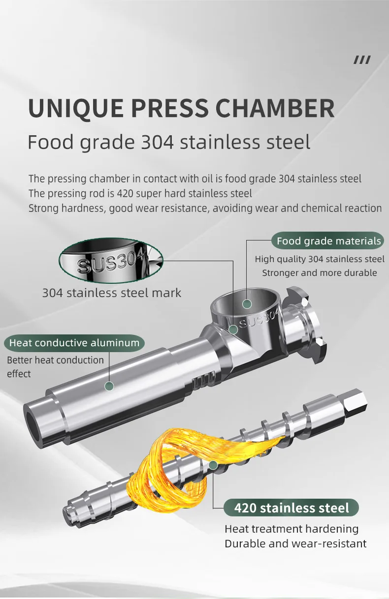 The machine is equipped with a powerful 200W motor and has a rated power of 820W, making it efficient for oil extraction.