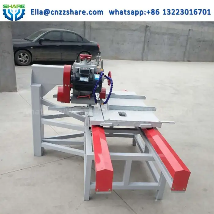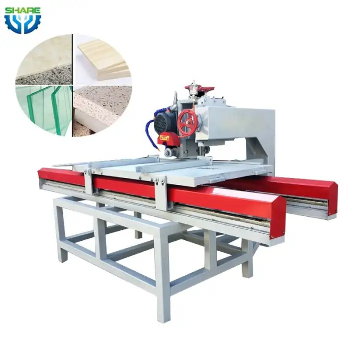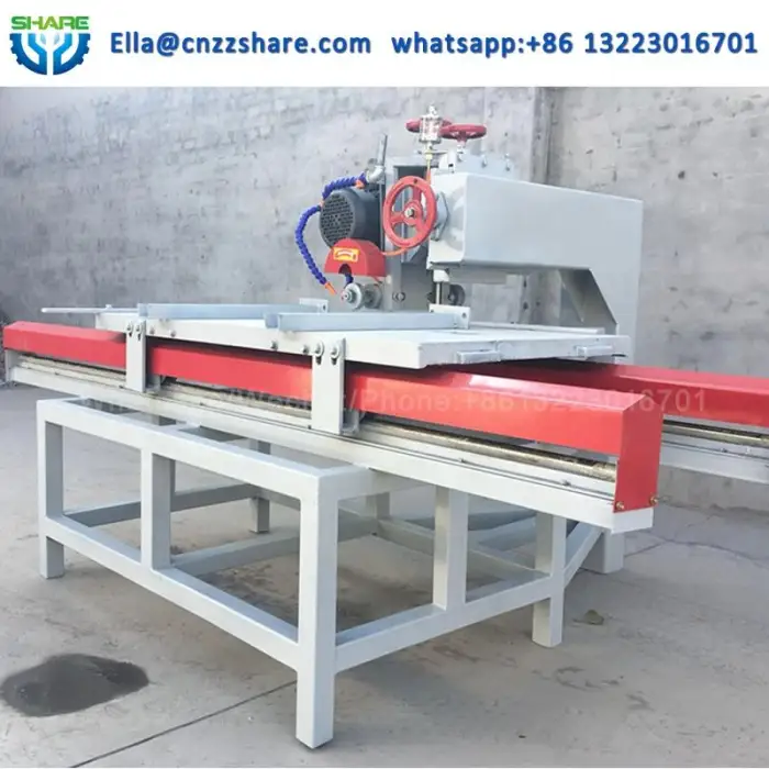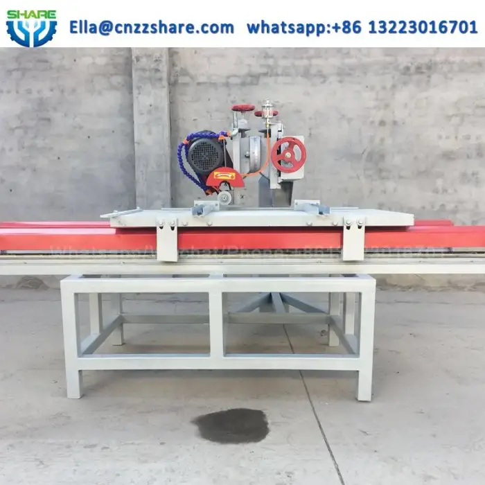 The machine works with various tile sizes and is specifically designed for cutting porcelain tiles.