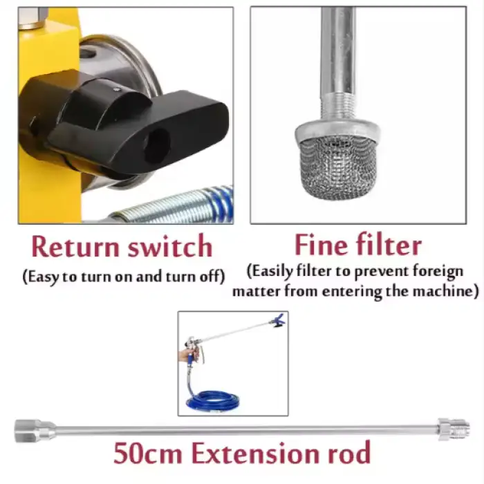 Key features include a high spraying effect for a smooth finish, a portable design, a powerful motor, and customizable options.