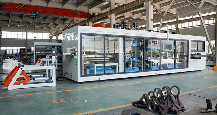 This machine can produce various plastic products including egg trays, clamshells, lunch boxes, and cup lids.