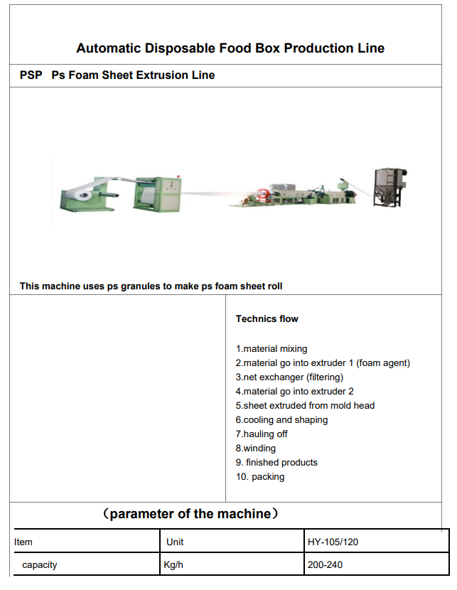 It is a set of machines designed to automate the process of producing disposable food boxes, including the extrusion of PS foam sheets and the forming of the boxes.