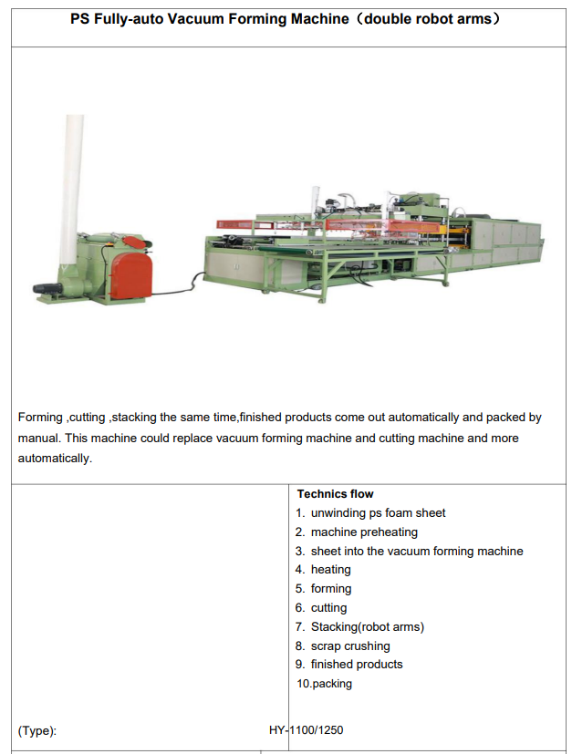 The line consists of multiple sets of machines including one PS foam sheet extrusion machine, one double robot-arm forming machine, one recycling machine, and several auxiliary components.