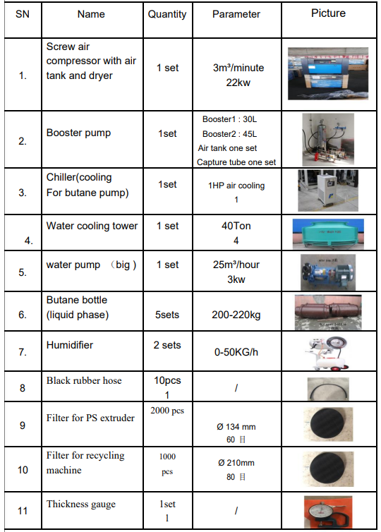 The production line includes a PS foam sheet extrusion machine, a double robot-arm fully automatic forming machine, a recycling machine with a crusher, an air compressor, a booster pump, a chiller, a water cooling tower, a large water pump, butane gas empty bottles, a humidifier, and various filter nets and hoses.