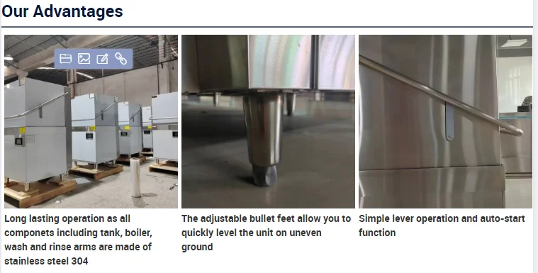 Key features include fully automatic operation, advanced ultrasonic technology, sanitize rinse cycle, durable stainless steel construction, and low water consumption.