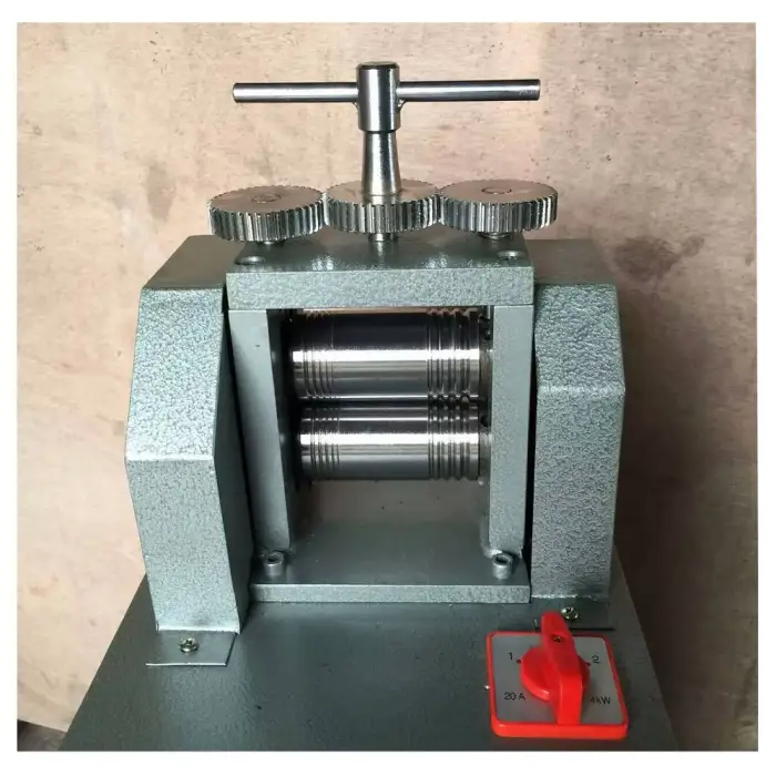 The Gold Silver Copper Jewelry Ring Metal Wire Sheet Rolling Mill Machine features a durable construction designed for long-lasting use in jewelry making.