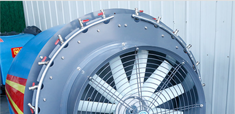 The machine has a large fan (800–1000 mm diameter depending on model) with variable-speed capability (e.g., 1800 rpm listed) and uses three-in-one precision nozzles. Nozzles are adjustable and multiple-nozzle design improves droplet fineness and uniform coverage.