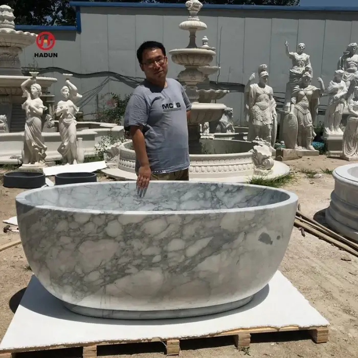 1. What materials are used in the Home Indoor Modern Design Freestanding Hand Carved Bath Tub?