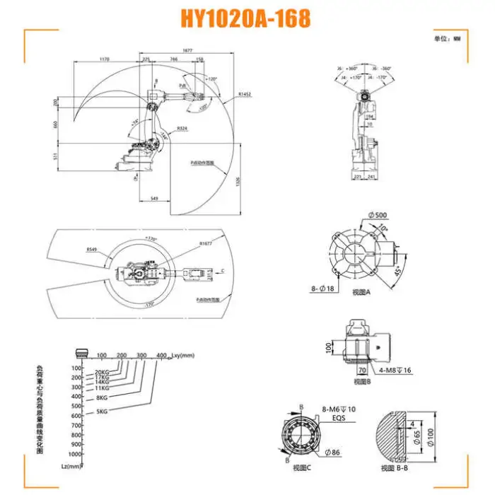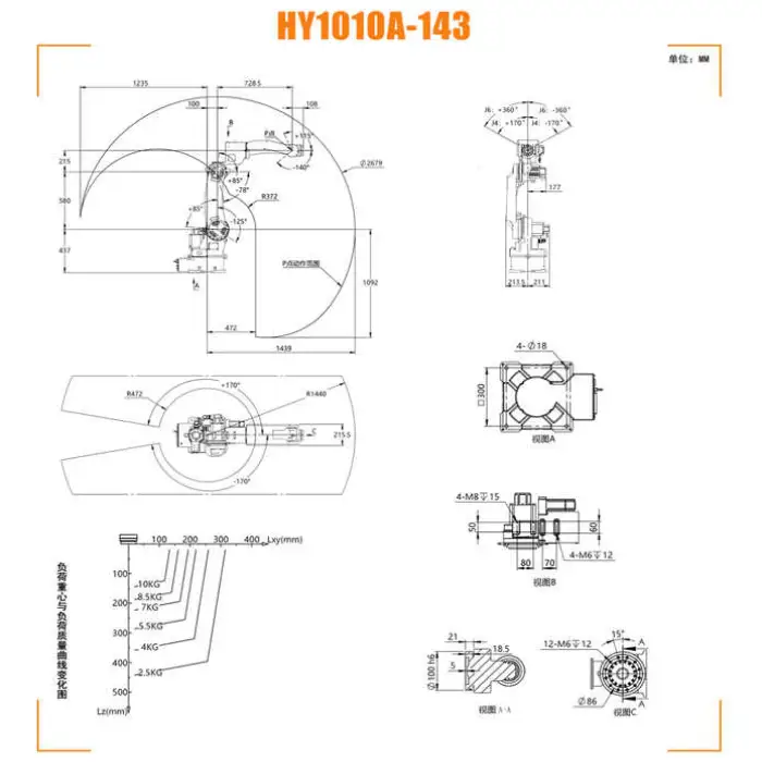 The robot has a maximum payload capacity of 10 kg, 20 kg, or 165 kg, depending on the configuration.