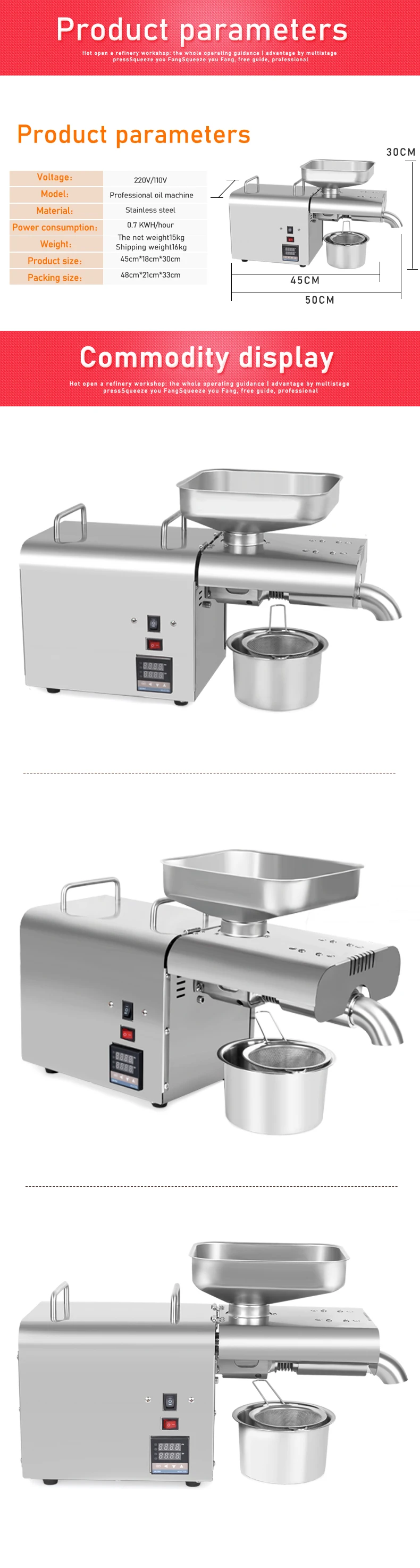 The K28C Oil Press Machine is compatible with both 220V and 110V power supplies, allowing for worldwide usability.
