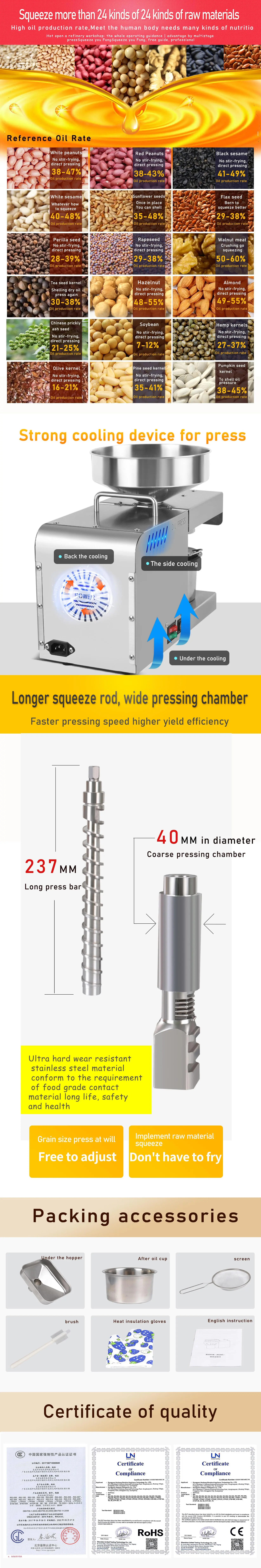 The K28C Oil Press Machine is suitable for processing a variety of oil-rich materials, including sesame seeds, sunflower seeds, peanuts, and more.