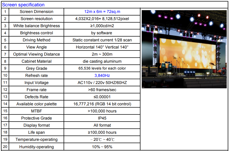 The dimensions of the K500 P2.9 Indoor LED display are 12 meters by 6 meters.