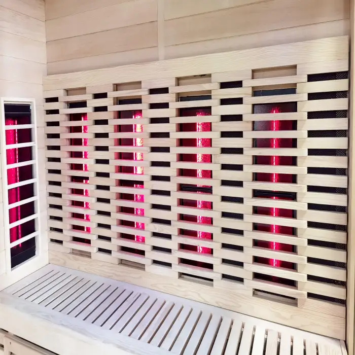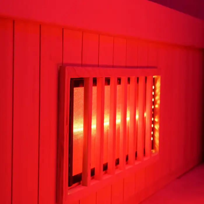 Red light therapy utilizes specific wavelengths of light to penetrate the skin, promoting healing, reducing inflammation, and enhancing overall wellness. It is integrated into the sauna to provide therapeutic benefits during your relaxation sessions.