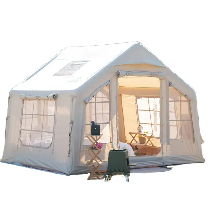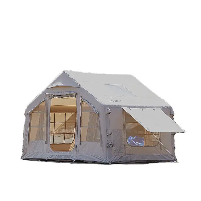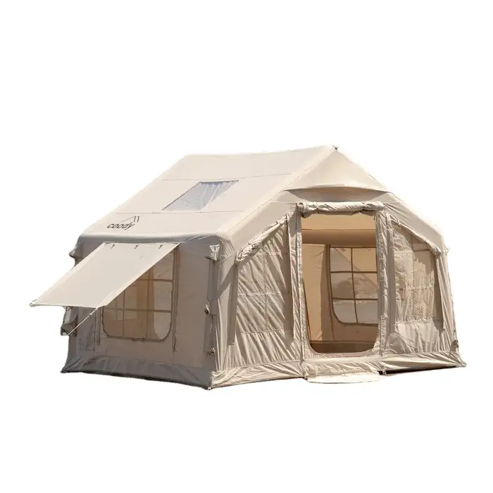 The tent is available in a beige color, designed to blend well with outdoor environments.