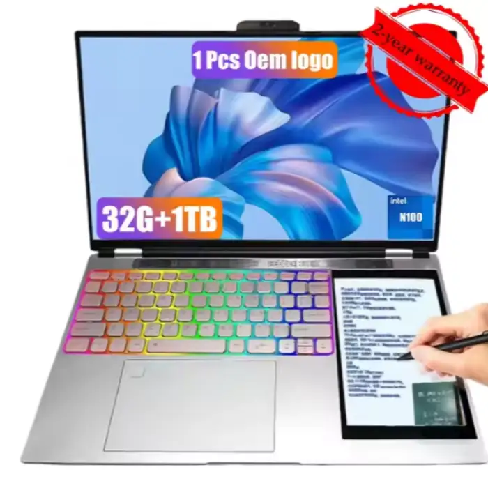 The laptop features a 15.6-inch primary screen and an additional 7-inch secondary screen.