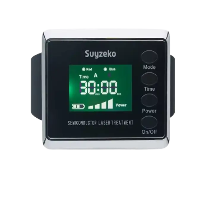 The device emits laser wavelengths of 650nm and 450nm, which are optimal for therapeutic effects in blood pressure regulation and pain relief.